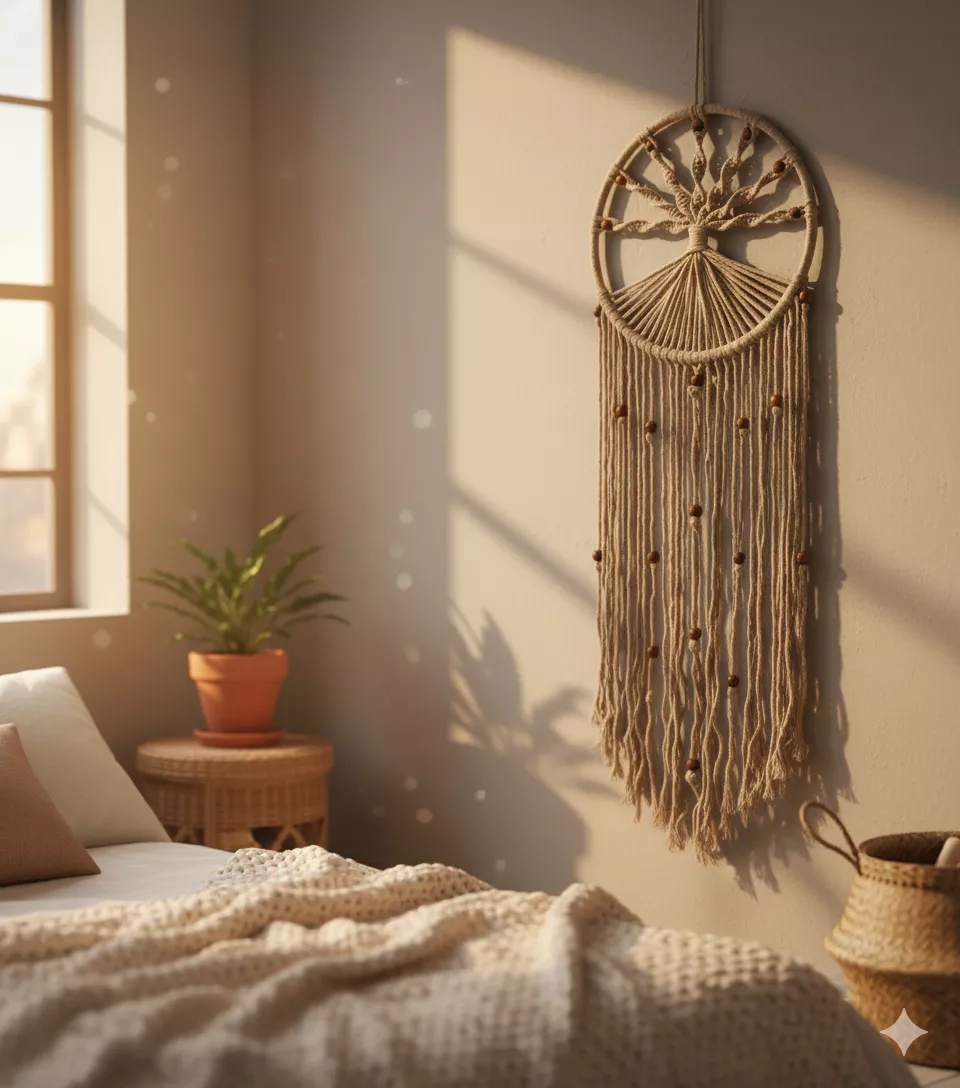 Ideal for bedrooms, living rooms, or cozy corners, the dream catcher can be hung above a bed, near a window, or on a wall to enhance the ambiance and create a serene, peaceful environment. Each piece reflects slow-fashion values, highlighting artisanal craftsmanship, sustainability, and timeless style.